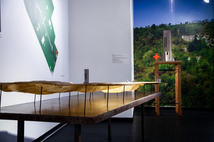 In der Architekturgalerie RAUMBURGENLAND contemporary, im Zentrum von Eisenstadt, werden von 5. November 2021 bis 20. Mai 2022, speziell für diesen Anlass angefertigte Modelle, Objekte, Pläne, Zeichnungen und Fotos präsentiert. Die Grube / The Pit ist der inhaltliche Dreh- und Angelpunkt der Schau und der gleichnamigen Publikation out ̅of the blue – Art + Architecture Out There.